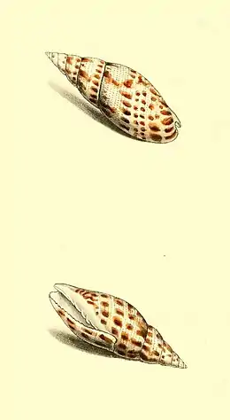 - M. Shell ovate-acute, white, with transverse punctured striæ; the basal whorl thick, with numerous bands consisting of small, and two of large tessellated spots; outer lip toothed.