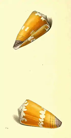 - C. testâ aurantiacâ, fasciis albis interruptis ornatâ; spiræ subdepressæ, anfractibus suturam juxta simpliciter sulcatis; suturâ alveatâ; basi granosâ, purpureâ.