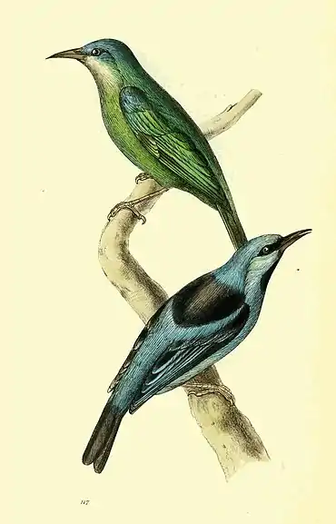 I am unacquainted with the other varieties of this species mentioned by authors. Of the bird here described, I have never seen any variety, either in Brazil or in our museums. The young males, as usual before moulting, have the colours of the female; one of them, in an intermediate state, is in my possession. As both the figures are of the size of life, and accurately coloured, a fuller description is unnecessary. The rich sky-blue of the male, in some lights, becomes greenish, and in others dark blue. The bill, like that of all the genuine Nectariniæ, is slightly notched a little way from the tip, and the base is much broader than high.