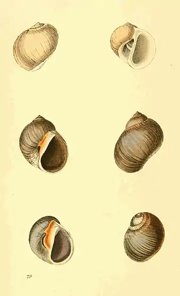- Shell sub-globose, uniform, fulvous-brown, obsoletely wrinkled, base with an elevated belt; spire depressed, the tip acute; umbilicus large, open; pillar termination slender, elevated, and central.