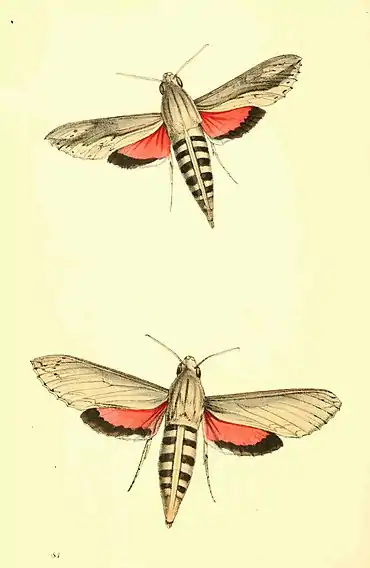 The two insects figured were received from Jamaica by my friend Dr. Leach, and there can be no doubt they are the sexes of one species. The upper is a male, and agrees with Drury's figure and description; the lower insect is a female, of which no representation has been published: as for Cramer's figure, if intended for the former, it is really so bad that it can hardly be quoted as an authority, and it appears to have misled Fabricius, in thinking that the female insect had a brown stripe on the anterior wings, whereas that character is more applicable to the male.