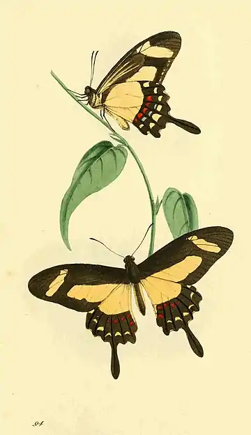 - P. (G. Caud.) Wings black; two bands on the anterior wings, and marginal lunules on the posterior, yellow; lower wings with obtuse tails, and a row of red dots between the nerves.
