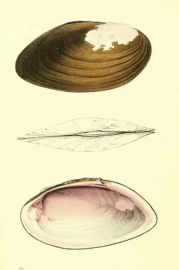 - Shell transversely oblong, thick, depressed, within purple; hinge plate thick, truncate, with an obsolete lamellar tooth in each valve; umbones retuse.