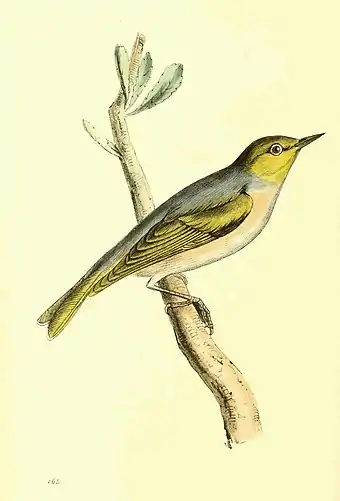 - Above cinereous, beneath whitish; head, wings, and rump, olive yellow; throat yellowish; eyes encircled by a ring of snowy feathers.