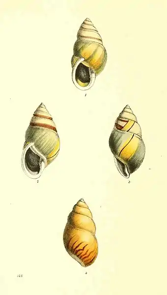 - D. Green, striped with yellow; inner lip white. Fig. 2. 3.