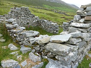 - π Slievemore Deserted Village is a settlement of 80 derelict single-room cottages, with their vegetable patches, fields and potato plots. Its residents left when famine struck in 1845, mostly moving to Dooagh to take up fishing. However until the 1940s it was still used as a "booley village": summer huts for herdsmen, when the cattle were moved up from the lowlands. In Irish bΓ³ means "cow", and "booley" features in many place names, showing that this was a common form of transhumance. The site is free to enter, park by the modern graveyard and walk up the track.