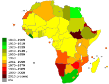 The decolonisation of Africa began with Libyan independence from Italy in 1951. Colonial powers employed varying means of control over their colonies, some granting natives representation in the government and cultivating a select few civil servants while others maintained a firm grip with an all-European government. In some countries, nationalist movements were quashed and their leaders killed or jailed, while others were able to peacefully achieve independence. In the 1950s, Guinea, Ghana and North African nations gained independence non-violently. In Algeria, France violently fought independence movements until 1963. With the establishment and new constitution of France's Fifth Republic in 1958, French West Africa and French Equatorial Africa ceased to exist, and after a brief "community" with France, the countries of these regions gained independence in 1960. By 1970, all but a handful of African nations were at least nominally independent. However, France made its former colonies and in West and Central Africa sign treaties that gave France control over their natural resources and monetary policy, and retains more influence in Africa than the other former colonial powers. The Portuguese bitterly fought to maintain their African possessions until 1975; all but one gained independence through war. Zimbabwe was the last major colony to gain independence from a non-African colonial overlord, in 1980, following a 14-year period of rule by a white minority government not recognised by Britain, the former colonial power. In 1990, semi-autonomous Namibia gained independence from South Africa and in 1993, Eritrea separated from Ethiopia following a protracted war – a peace deal was only achieved in 2018. South Africa remained under firm control by its white minority, oppressing its black, Asian and mixed-raced populations under a system called apartheid until 1994. Morocco maintains control over Western Sahara despite an established independence movement, and this remains a point of contention between Morocco and Algeria. The conflict flared up again in 2020. Following years of civil war, South Sudan became independent from Sudan after a referendum was held in 2011.