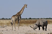 Black rhinoceros and giraffe in Etosha National Park, Namibia