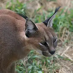 The caracal is a medium-sized wild cat native to Africa, the Middle East, Central Asia, and arid areas of Pakistan and northwestern India. It is characterized by a robust build, long legs, a short face, long tufted ears, and long canine teeth. Their name means cat with black ears.