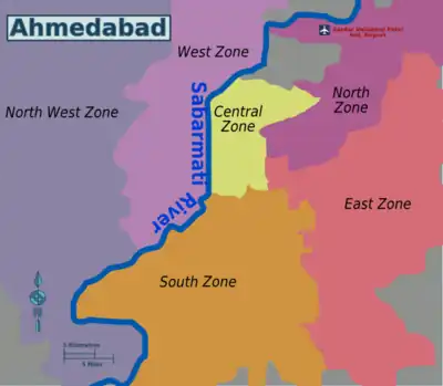 The classification below is according to Ahmedabad Municipal Corporation (AMC). The West Zone and New West Zone are on the west side of the Sabarmati River while all other zones are on the east side. Locals rarely refer to these zones, but rather to one of dozens of neighbourhoods of which the city is made up.