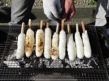 The most well-known Akita dish is kiritanpo. Kiritanpo is essentially a tube made of rice, generally formed around a disposable chopstick. It is often roasted, sometimes after being smothered in miso paste. It is also eaten in kiritanpo nabe, a stew of sliced kiritanpo, vegetables, and chicken or fish, most commonly eaten during the winter. Of course, there are many non-local styles of food available in Akita City, including a wide variety of ramen and Indian restaurants.