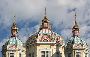 • ๐ŸŒ Ascension Cathedral (Zenkov Cathedral), Gogol 40 (Panfilov Park, Metro Zhibek Zholy). Daily 07:00-18:00. Completed in 1907 and renovated in the 2020s - new saints were painted in, though presumably they were known to the hagiographers. The iconostasis is spectacular. At 56 m this among the tallest wooden buildings in the world, which you wouldn't guess from the smoothly-painted exterior hues of custard, icing sugar and coloured marzipan - it's more like a trap for Hansel & Gretel. Free.