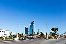 Northeast along Rambla Armenia, the tall palms have been replaced by lower ones and the are no longer placed evenly along the road. The houses are taller, further from the street and with more space between them. At one point you can look left to catch a glimpse of Montevideo's three 🌍 World Trade Center skyscrapers. The street makes a couple of turns, and changes name to Rambla República de Chile. Then it passes the 🌍 Zoological museum with its minaret-like tower to the right and the 🌍 Buceo cemetery to the left. And yet another beach with a faraway view; 🌍 Playa Buceo. The parallel road that goes up the bank connects to Bulevar José Batlle y Ordóñez, another of Montevideo's major thoroughfares.
