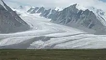 The snow-capped Kuiten Uul mountain, 4374 m (14,201 ft), is the highest of the five peaks of Tavan Bogd Mountains (literally '5 Saints') that gives the park its name. It covers an area of 630,000 ha and is home to three large freshwater lakes and 34 glaciers, plus several waterfalls. The largest, Potanin Glacier, covers 23 km2. Tavan Bogd Mountains are considered sacred to local Kazakhs, Tuvans, and Mongolians. The park stretches from Russia along the Chinese border, following the Altai Mountain Range that divides China, Russia, Mongolia, and Kazakhstan, for over 200 km. Ancient tribes have left many artifacts, using the region for religious ceremonies. Today, tens of thousands of petroglyphs in the park are part of a World Heritage Site. In addition there are numerous Turkic Stone Men and stone burial mounds.