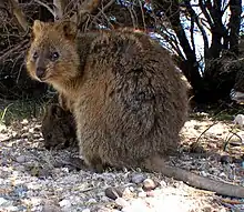 Quokkas, Setonix brachyurus, are a marsupial that looks like a small, chubby kangaroo with a cute face. In the 2010s they have become known online as the "world's happiest animal" due to their cute, cheerful appearance. Quokkas are only found in the wild in Rottnest Island off the coast of Perth, Western Australia. At Rottnest Island they are very common and willing to approach humans, and "quokka selfies" are an online craze, but it's forbidden by law to touch a quokka. In captivity, quokkas can be found at a number of zoos throughout Australia.