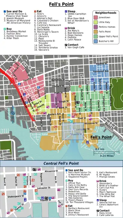 - 🌍 Fells Point Visitor Center and Maritime Museum, 1724 Thames St, ☏ +1 410-675-6751. Jan-March: Su,Tu-F noon-5PM, Sa 11AM-7PM; Apr-Dec Tu-Th noon-5PM, F 11AM-8PM, Sa 10AM-8PM. Run by the Baltimore Historical Society, the visitor center is a nice, sleek space to stop by, with exhibits and artwork related to the maritime history of the neighborhood, as well as information on what to do and see in the area. Free.