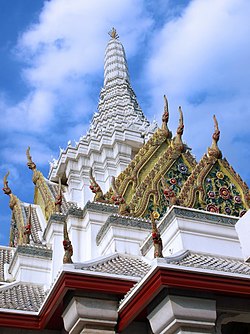 - 🌍 Wat Ratchanaddaram (วัดราชนัดดาราม), 2 Maha Chai Rd (Panfa Leelard Pier), ☏ +66 2 224-8807. 08:00-17:00 daily. Wat Ratchanaddaram is a temple compound built by order of King Rama III in 1846. Its main structure, Loh Prasat (โลหะปราสาท, Thai for metal castle), is easily spotted as its spires are of black iron, not the usual glittery gold. It is in a highly unusual style: the wat itself is a five-storied gleaming white structure with rows of Buddhas and nice views from up top, very elegant, calm and relaxing after the crowds at the big temples. A good view of Bangkok is afforded from the top tier. The 37 metal spires signify the 37 virtues towards Enlightenment. At night, the square around it is beautifully illuminated. Also check out the Buddhist market at the rear of the complex. Free.