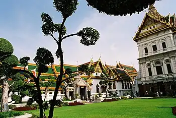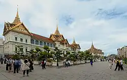 Leaving Wat Phra Kaew, on the right you'll see a Chinese gate that is adorned with beautiful small porcelain pieces. Move on and you'll be guided past the beautiful palace buildings. The first you'll see is the Phra Maha Montien (พระมหามณเฑียร) complex and its accompanying buildings. This has been the residence of Siam's kings before King Rama V decided to move to the Chitralada Palace in Dusit. The Amarin Winichai Hall (พระที่นั่งอมรินทรวินิจฉัย), the building's main audience hall, can be accessed by visitors on weekdays. It was used as an audience hall welcoming foreign guests. Inside is the boat-shaped Busabok, an open sided throne topped with a spired roof. It is often used for ceremonies, such as the King's annual birthday speech.