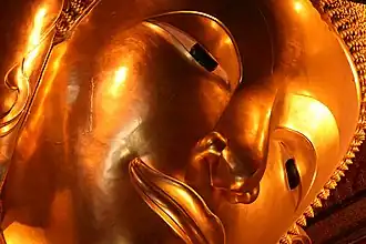Moving on to the western courtyard, you'll quickly stumble upon the Reclining Buddha — gold plated, 46 m long, 15 m high, with inlaid mother-of-pearl soles. It is an impressive sight and definitely one you must see on your trip. The Reclining Buddha shows the passing of the Buddha into nirvana, the Buddha's final state of enlightenment before his death. At the back of the statue, you can buy a bag of 50-satang coins and plunk them one by one into the row of copper pots for good luck. Outside the building, four chedis commemorate the first four kings of the Chakri dynasty. The central chedi is the oldest one, it was erected by King Rama I to hold the remains of the Phra Si Sanphet, the most sacred Buddha figure of Ayutthaya. The chedis to the north and to the south house the remains of King Rama II and King Rama III respectively.