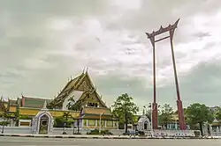 - 🌍 Wat Suthat and the Giant Swing (วัดสุทัศน์และเสาชิงช้า), 146 Bamrung Muang Rd (Panfa Leelard Pier), ☏ +66 2 222-0280. 08:30-21:00 daily. This wat is becoming more and more off the beaten path as it is quite hard to walk here from the Grand Palace. Wat Suthat is huge and actually one of the most important temples for the Thai people. It's large size was needed as it was constructed in the early 19th century to house the huge Phra Sri Sakyamuni Buddha image, brought all the way down from Sukhothai by boat. The outer wall of the cloister has more than 150 Buddha images lined up, and as they are being re-gilded, they are in various states of repair. Outside is an open courtyard with many Chinese statues. The Giant Swing (Sao Ching Cha) is a huge red frame on the plaza opposite the main entrance of Wat Suthat. The swing was used in an annual ceremony where teams of young men would try to swing high enough to retrieve a sack of gold that was tied to a pole about 25 metres high in the air. The ceremony has been banned since 1932, as many people got injured or died trying. The swing was fully renovated in 2007 and now looks as good as new. 100 baht.
