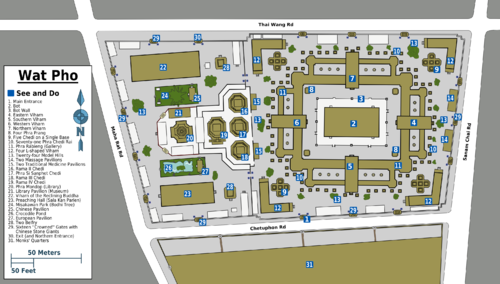 The Wat Pho complex is divided into two walled compounds with Chetuphon Road separating them. The southern compound, Tukgawee, is barely visited as it is a working Buddhist monastery with monks residing there. The northern compound can be divided into an eastern and western courtyard. Bus loads of tourists get in using the north entrance at Thai Wang Road, stand in line to get a quick peek of the Reclining Buddha, and then quickly head off again. That's a mistake. Better take the south entrance at Chetuphon Road, which actually is the main entrance. From there, you can start exploring the complex while missing out on most of the tourist crowds. The admission fee is 300 baht, and the temple is open 08:00-17:00. You can arrange an English-speaking personal guide that provides you with interesting information about the complex. This costs around 200-400 baht, depending on the size of your group (and your negotiating skills).