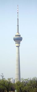 - 🌍 Central TV Tower (中央电视塔 Zhōngyāng Diànshìtǎ), 11 West 3rd Ring Rd Central (southwest of the Hangtianqiao Nan (航天桥南) bus stop on 3rd Ring Rd). A tower with an observation deck at the height of 238 meters, providing a view of central Beijing. Below the observation deck is a dedicated television cultural center at 235 m, with a virtual television studio scene. A revolving restaurant at 221 meters provides both food and scenery. ¥90 for admission ticket; ¥258 for lunch at the revolving restaurant; ¥308 for dinner at the revolving restaurant.