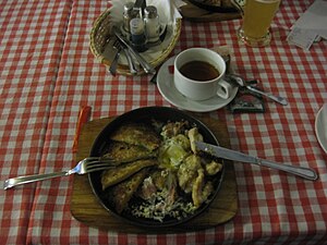 Meat and meat products, especially pork and salted pork fat, play a major role in the diet of Belarusians. One of the people's proverbs says: "There is no fish more tasty than tench, and there is no meat better than pork". Salted pork fat is used slightly smoked and seasoned with onions and garlic. Pyachysta is one of the traditional holiday dishes. This is boiled, stewed or roasted sucking pig, fowl or large chunks of pork or beef. Dishes prepared from meat are usually served together with potatoes or vegetables such as carrots, cabbage, black radishes or peas. It is characteristic that many vegetable and meat dishes are prepared in special stoneware pots.