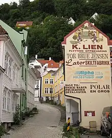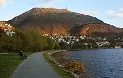 - From Bryggen area, Mt. Fløyen rises steeply. The slopes of Mt. Fløyen are dominated by wooden residential buildings, some among the finest and most expensive in town.