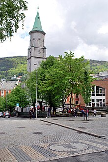 The geographical centre of Bergen is the intersection of Torgallmenningen and Ole Bulls plass, indicated by the "blue stone" a nine meter long slightly inclined slab. Torgallmenningen square and Ole Bulls plass are the main axes in central Bergen. Historically, the centre was slightly more east at Vågen (the bay) or at Bryggen.