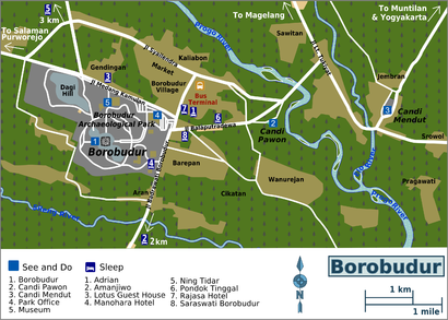 - 🌍 Manohara Hotel, Jl Badrawati, ☏ +62 293 788680. This friendly resort-style hotel is located inside the Borobudur Park, run by the park authority, and is 200 m from the temple entrance. The grounds are beautifully landscaped and the views are great, but the rooms are little more than functional with air conditioning, hot water and passable bathrooms. The real reason to book here is the Borobodur Sunrise package, which costs an extra Rp. 500,000 per person, but gets you into Borobudur at 04:30, a full hour and a half before the public gate opens. From Rp 1,700,000.