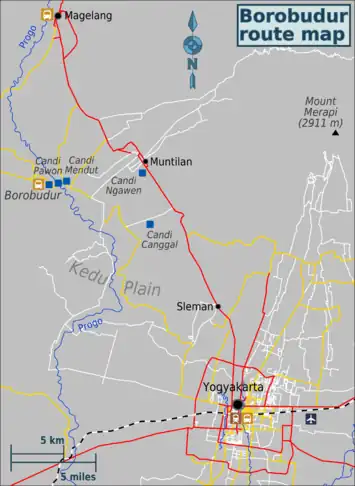Between Yogyakarta and Magelang lies the volcanic Kedu Plain. This was clearly an important area in pre-10th century Javanese history as it contains a whole host of ruins (both Buddhist and Hindu) dating from the same era as Borobudur, and easily reached from there. If you have a car, the most accessible of these together make an interesting use of the late part of the day on the way back to Yogyakarta after you have seen Borobudur. Alternatively, if you are staying in the Borobudur area, rent a bicycle and explore these temples together with the verdant local countryside.