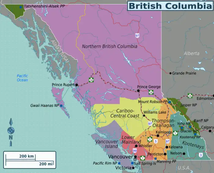 British Columbia (BC) is the westernmost province of Canada, between the Pacific Ocean, and the Rocky Mountains. BC has great scenery along the coast and inland, and is a rewarding destination for outdoor life, especially downhill snowsports and wilderness backpacking.