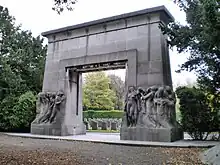 - π British Waterloo Campaign Monument, Rond Punt der Geallieerden. Monument for British officers killed during the Waterloo Campaign of 1815. After being suggested in 1861,the City Council of Brussels approved to donate about 30 mΒ² of cemetery to re-bury British officers whose graves were in or around Brussels, and on cemeteries around the battlefields of Waterloo and Quatre Bras. Queen Victoria personally oversaw the funding of a suitable monument. The sculpture, a design of Belgian artist Jacques de Lalaing, is a large edifice of bronze figures on a plinth of stone blocks. It depicts Britannia with her helmet and trident lowered, surrounded by weapons, uniforms and equipment. Inscribed to the sides of the plinth are shields bearing the names of the regiments that participated in the campaign. The monument was unveiled in 1890, with below it a crypt with 16 niches. It now contain 17 bodies, all of which were transferred here between 1890 and 1894. Of the 17 men, all but one died during the campaign: Sergeant-Major Edward Cotton survived the battle and became a tourist guide to the battlefields after the campaign. He was buried at Hougomont after his death in 1849 and also transferred to the Monument.