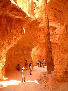 - 🌍 . (1.3 miles / 2.2 km round trip). One of the most popular trails in the park, leading through the heart of the Bryce Amphitheater past formations such as Thor's Hammer and Wall Street. The trailhead is at Sunset Point.