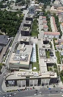: 'Széll Kálmán tér'). Protected Monument Building. A landmark of Szell Kalman square hilly side.