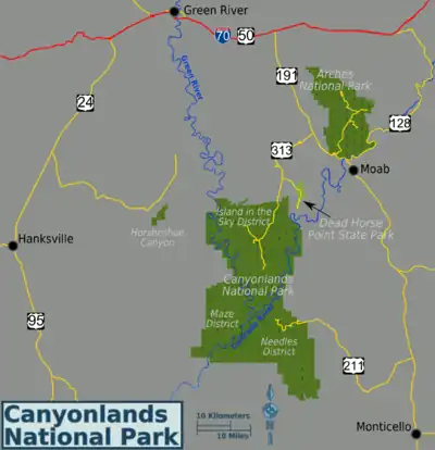 Canyonlands National Park is a national park in Utah's Canyon Country. The small town of Moab is the gateway to this and the nearby Arches National Park. It is divided into three districts not connected by roads interior to the park: the Island in the Sky, the Needles, and the Maze (including Horseshoe Canyon). The Island in the Sky offers sweeping vistas over the lower two districts; the Needles and the Maze are more rugged, backcountry districts that offer excellent backcountry hikes and camping.
