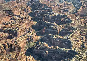 Daily air tours to Canyonlands National Park in a Cessna aircraft are provided from the Canyonlands Field Airport in Moab. The aircraft seats about 7 people (including the pilot). The flights take you over all of the most scenic parts of Canyonlands including the Maze District, Island in the Sky, Dead Horse Point, the Colorado River and more. Typically flights last about 1–2 hours. Helicopter flights are also available as a tour-by-air option.