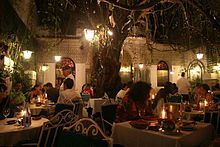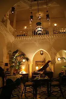 - 🌍 Rick's Cafe, 248 Rue Sour Jdid, ☏ +212 22 27 42 07, [email protected]. This restaurant claims to have recreated the eponymous cafe from the movie Casablanca. Excellent location, within a 20-minute walk of the Hassan II Mosque and in the walls of the Old Medina bordering the ocean. The food is excellent, though expensive. Eat at one of the tables on the second floor for an excellent view of the seats below and the niveau-Moroccan decorations or eat on the ground floor to be nearer the piano player who plays, of course, "As Time Goes By" every night. Excellent selection of wine and liquor and, for Morocco, a thorough beer selection (5 different brands). The staff, in tuxedos and fezes, are superb. Dress code. Do not show up in shorts. dinner for 2 ~800 dirham..