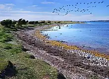Geese over the shore at Vivesholm Nature Reserve in the Sanda district