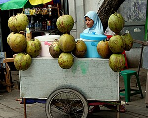 Besides socialising, another reason to drink is to stay hydrated. One of the pleasantest ways to do that in Central Java is with fresh, young coconut water degan (DUH-gan). Look for the pile of used coconut husks by the side of the road. The top will be chopped off a whole one, and a straw stuck in. That's all that's needed. You may be offered sugar syrup or some other flavouring, or ice. Up to you. The bonus is the jellyish flesh you get to scrape out with a spoon. In a restaurant they will do all for you, and tip it into a glass.