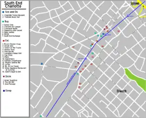 South End is a district in Charlotte. Extending from the southern side of the I-277 freeway loop south of Uptown, it extends along South Boulevard toward I-485. It was historically dominated by mills and factories, but it has been reborn as an arts and entertainment district. It is one of the city's fastest-developing districts, primarily due to the placement of a light rail line along South Blvd.