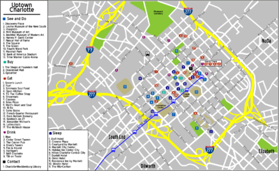 Charlotte's "biggest" attraction is its skyline. Dominated by the Bank of America tower (a Cesar Pelli masterpiece), the skyline is largely composed of striking modern towers. Tucked into the inner avenues are shorter, historic towers; however, only a few of these remain. The result is that Charlotte has a highly recognizable skyline that has been in a state of flux for about 30 years. Visitors to Tryon St. often note that the preponderance of huge towers makes it feel like a slice of Wall Street, though the illusion fades quickly only a few blocks away. When visiting Tryon St. it is worth spending some time in the Bank of America lobby, which is dominated by three expansive frescoes by North Carolinian Ben Long. Another Long frescoe is inside a dome at the Transamerica building only a short walk down the street. Another major architectural attraction is the Hearst Tower, which puts a modern spin on Art Deco. Its impressive facade and unusual profile have made it something of a cult favorite among students of architecture. It has often been said that the Hearst Building and Bank of America tower are a scaled-down version of New York City's Chrysler and Empire State Buildings. Not all of Charlotte's architectural energy is spent on Tryon St. Most of the middle-ring neighborhoods have retained their historic styles. 1920s bungalows dominate the old mill-village neighborhoods, while large 19th-century country estates are to be found in Myers Park. Though these are far more understated than the huge corporate towers Uptown, they are indicative of Charlotte's real architectural heritage. |