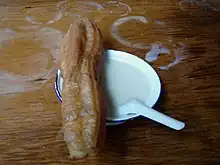 Typical breakfast foods: a youtiao (oily pastry) with doujiang (soymilk)