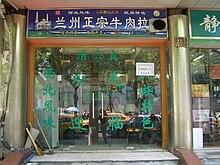 • Lánzhōu lāmiàn (兰州拉面, Lánzhōu lāmiàn), fresh Lanzhou-style hand-pulled noodles. This industry is heavily dominated by members of the Hui (回族) ethnic group—look for a tiny restaurant with staff in Muslim dress, white fez-like hats on the men and head scarves on the women. If you're looking for halal food outside a Muslim-majority area, these restaurants are a good bet—many have signs advertising "halal" (清真, qīngzhēn) in Chinese or Arabic.