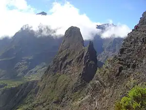 Cirque de Mafate is a cirque in Réunion National Park, the western of the three craters on the extinct volcano Piton des Neiges on the volcanic island of Réunion in the Indian Ocean . Due to the lack of an access road, the Cirque de Mafate is only accessible on foot and from the air and is highly attractive hiking terrain in a wild, rugged volcanic landscape with a tropical-exotic natural area. As part of the "inner zone" of the Réunion National Park, which was founded in 2007, the valley basin is a UNESCO World Heritage Site.