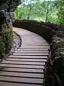 Many of the stone work and pathways got their start from the Madison and Indianapolis railroad being built in the area around 1852. The railroad went bankrupt, leaving excellent foot trails and a muddy rock strewn 600-foot tunnel accessible by the trails.
