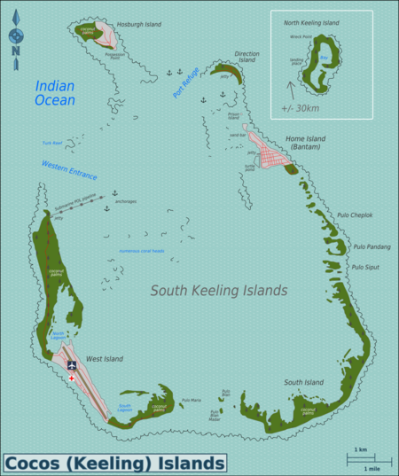 The Cocos (Keeling) Islands (Cocos Malay: Pulu Kokos (Keeling), Malay Wilayah Kepulauan Cocos (Keeling)) or simply Cocos Islands or Keeling Islands are a chain of islands in two adjacent atolls, in the middle of the Indian Ocean some 2,750 km northwest of Perth, and around 900 km west-southwest of Christmas Island. The islands are generally considered to be the southernmost point of Asia.