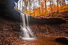 The park encompasses 51 mi² (134 km² and 33,000 acres) along the banks of the Cuyahoga River, spanning from the major metropolitan areas of Cleveland and Akron and into the hills of the Allegheny Mountain range. The diverse landscape, including sandstone ledges, 70 waterfalls (most notably Brandywine Falls), rolling hills and river gorges, can be viewed from 186 mi (299 km) of trails.