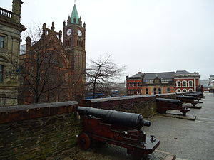 - Guildhall, Guildhall St BT48 7BB (opposite Tower Museum), ☏ +44 28 7137-6510. Daily 11AM–4PM. Built in 1890, this fine building is where the city council meet. It's just outside the city walls, and for decades its councillors saw their role as shutting the Catholics out of housing and jobs as effectively as the walls shut out King James. It therefore became a target for nationalists and was twice bombed. It contains a museum exhibit on the history of Derry, a small exhibit on the Saville Inquiry and houses the Nobel, Gandhi and Martin Luther King Jr peace prizes of John Hume. In summer there are guided tours but these are suspended in 2021, but an outdoor 15-minute tour is available on request for £2 as of February 2023. Free.