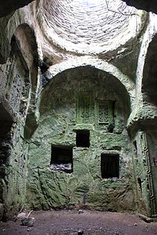 - π Goshavank Monastery (22 km east of Dilijan: 16 km following the main Dilijan-Ijevan highway and then 6 km off this road after the turning to the monastery.). Goshavank monastery is surrounded by a traditional village. There is a groundskeeper who opens the main church building up for visitors and can give a tour. This is the one church in all of Armenia where entrance to one of the chambers is not free. The chamber is nice, but you can certainly enjoy the rest of the complex without it, especially since it may not be offered in English. There are excellent carved details and khachkars here, but the "lacework" khachkar at Goshavank is one of the most impressive in the world.